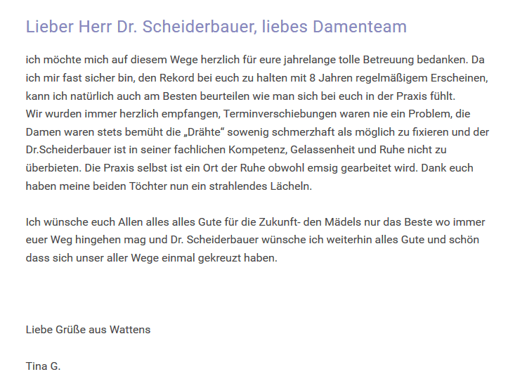Nach 3 Fehlversuchen, einen Kieferorthopäden mit ☀️Wohlgefühl ☀️ In Innsbruck zu finden kamen wir mit unserem Sohn zur Praxis Dr Scheiderbauer und waren von der ersten Minute an begeistert. Vor allem als unser Sohn sofort blieb und endlich mit einer Regulierung beginnen wollte! Freude! Bei allen Beteiligten! Selbst der Abdruck war mit der ruhigen und Lieben Assistentin kein Problem mehr. Ich freue mich stets auf die Kontrollen, weil ich mich immer entspanne, sobald ich die Ordination Dr. Scheiderbauer betrete. Man spürt viel Feinsinnigkeit und Menschenfreundlichkeit bei allen .... ja ich bin ein absoluter Fan und kann das gesamte Team nur aufrichtig empfehlen!!!! Die Aufklärung ist sehr professionell wie die Arbeit und das Ergebnis. Wenn ein akuter Besuch notwendig ist gibt es problemlos Soforttermine gleich nach dem Schulunterricht! Alles wunderbar!!! Mein Sohn ist inzwischen im dritten Behandlungsjahr und ist sehr glücklich und entspannt mit seiner Regulierung, er ist derzeit 15 Jahre alt. Erwähnenswert noch die Weihnachtszeit in der Praxis! Weihnachtszauner liegt dann in der Luft, der Trubel in der Innenstadt scheint plötzlich unwirklich, ein Weihnachtsbaum mit Schneegestöber!!!!! Sorgt für kindliche Freude und zu Guter letzt bekommt man noch eine Weihnachtsgeschichte geschenkt, die noch lange nachwirkt in Herz und Kopf. Ein wahrer Gewinn , Patient der Praxis Dr. Scheiderbauer zu sein!!!!!! Ein großes Danke an alle !!!!!!!"